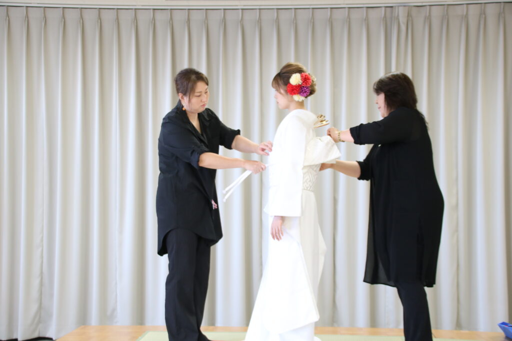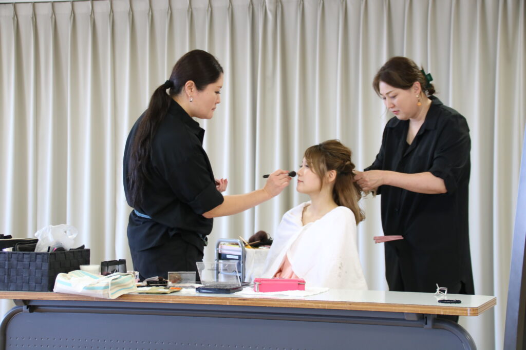 今回は、学生をモデルに洋装のヘアスタイル・メイクから和装のヘアスタイル・メイクへのお色直しの様子を見せていただきました。