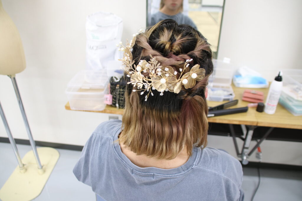 学生同士でヘアメイク、ドレスフィッティングを行い、トータルコーディネートを完成させました。